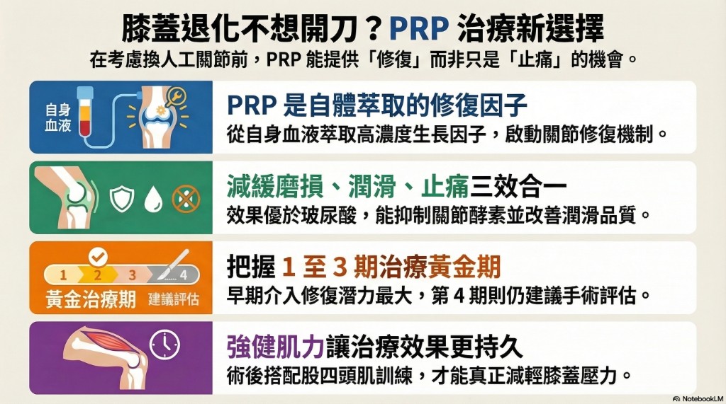- 第四期(骨頭幾乎直接接觸):PRP 效果有限,此時手術評估更重要。