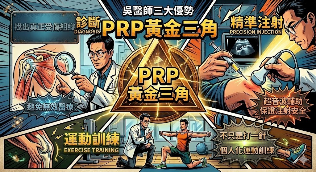 PRP 像是「啟動修復的開關」,真正讓身體恢復功能的,是後續的肌力訓練與動作調整。吳醫師在注射後會幫你安排個人化運動訓練,搭配回診檢查。